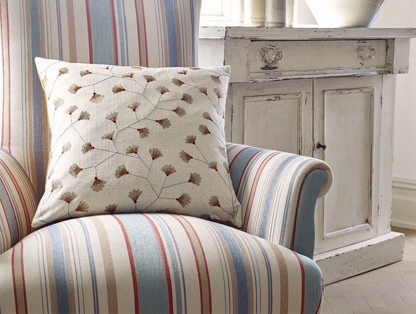 This embroidered leaf trail fabric has a modern, country style and features abstract gingko leaves in a range of gentle colourways on neutral backgrounds.
