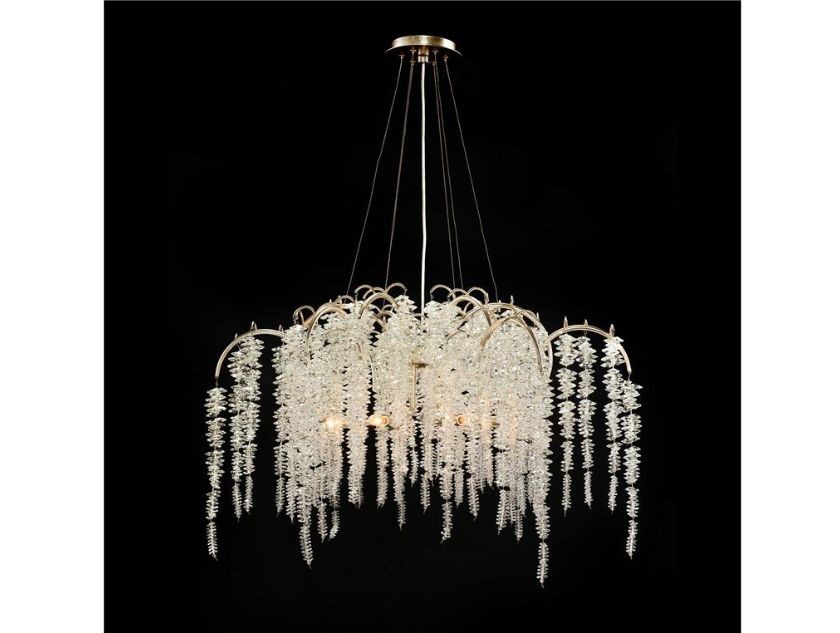 A cascading crystal waterfall chandelier with six lights is in antique silver leaf.