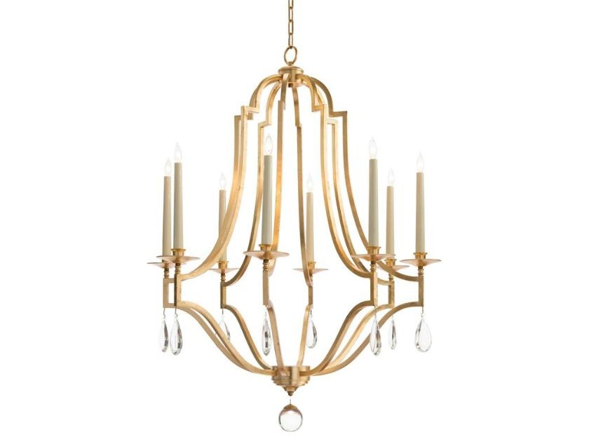 A graceful eight-light chandelier in a gold-leaf finish has tapered candles and is adorned with polished, smooth crystal drops.
