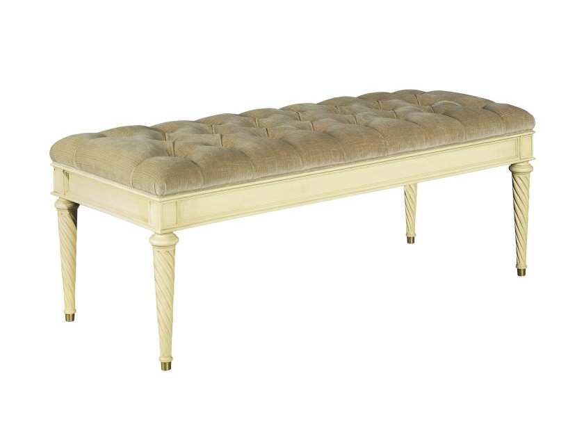 The Simon Bench has spiral carved legs that terminate with antique brass ferrules. Standard with a tufted top, It is available with an untufted version as well. Chippy White paint shown.