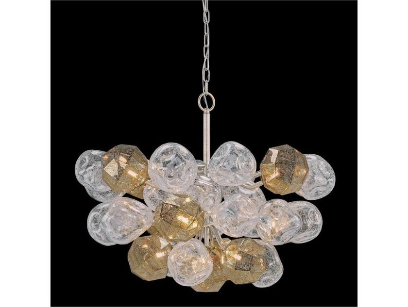 cluster of wispy glass spheres, accented by perforated brass orbs with a