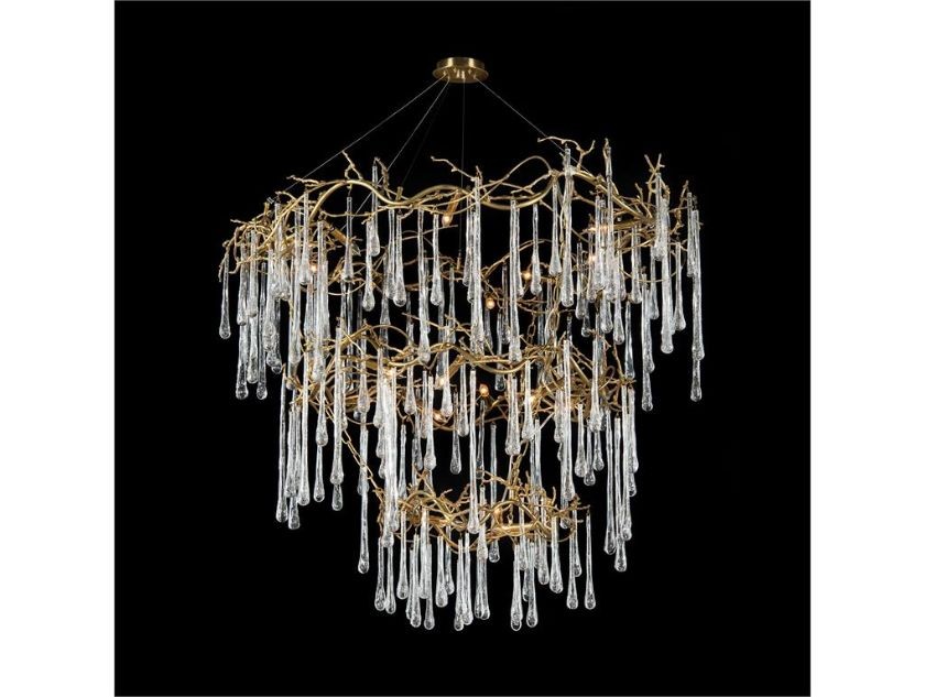 Organically formed brass branches form this three-tiered, twenty-light chandelier dripping with handblown glass teardrops.