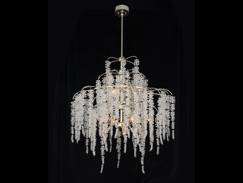 A cascading crystal waterfall chandelier with twelve lights is in antique silver leaf.