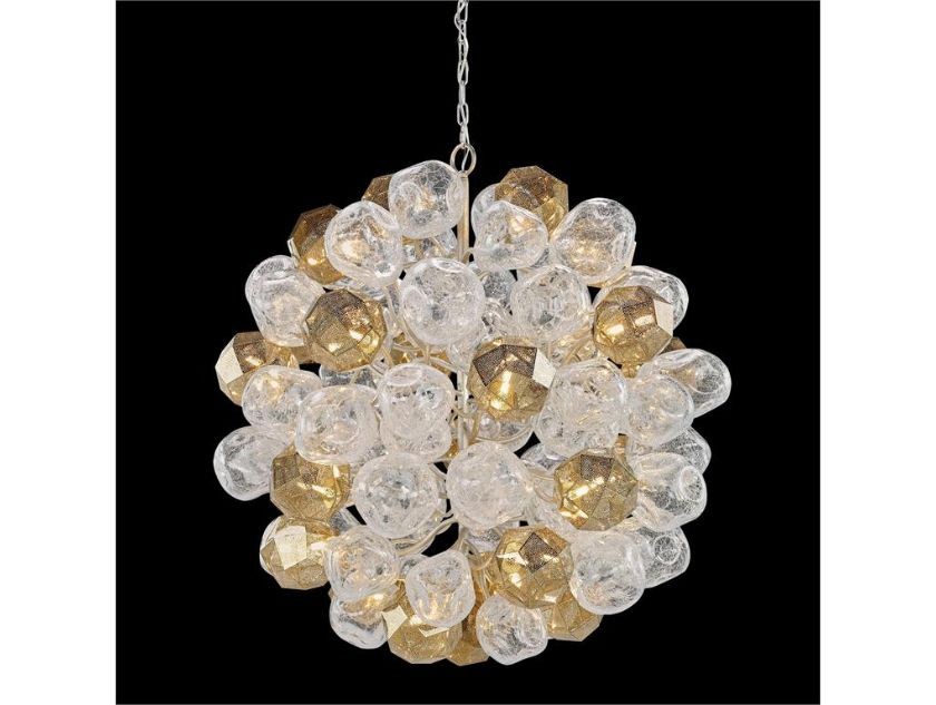 cluster of wispy spheres of mouth blown glass, accented by perforated brass